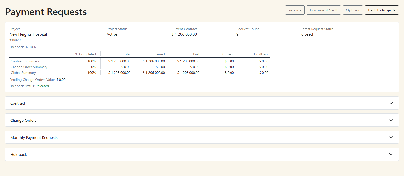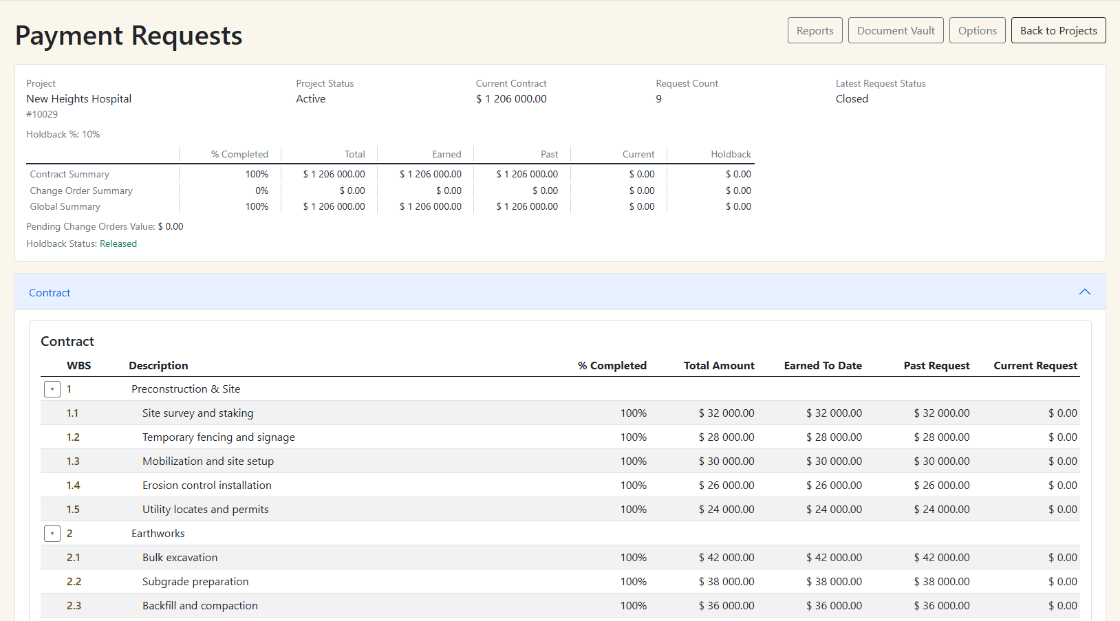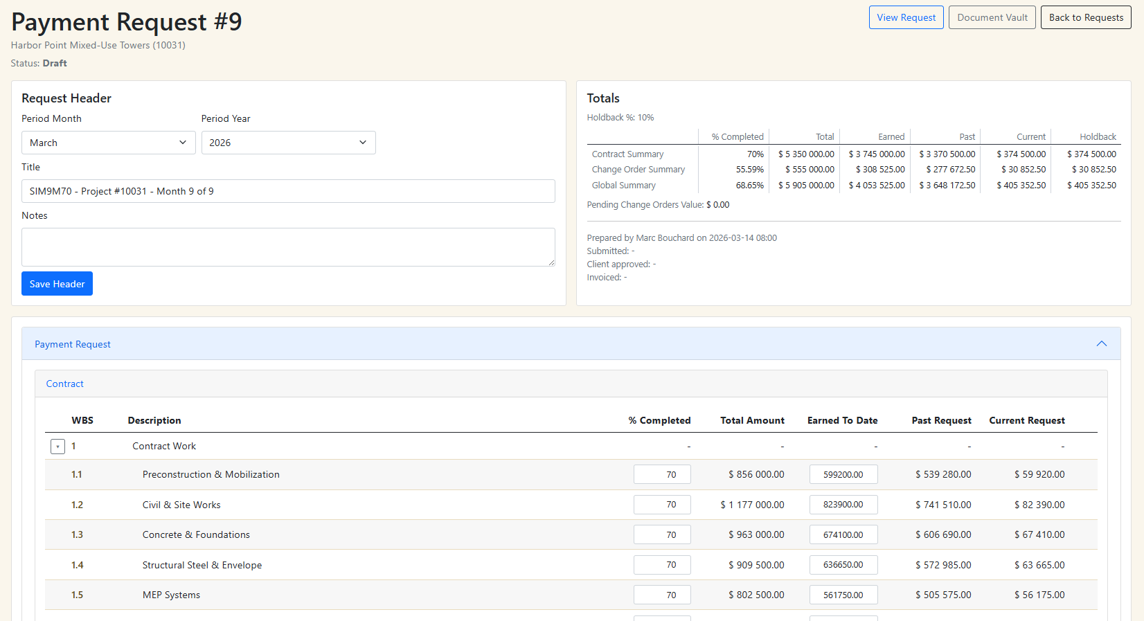 Real workflow views from project setup, payment requests, contract progress, holdback, and change orders.